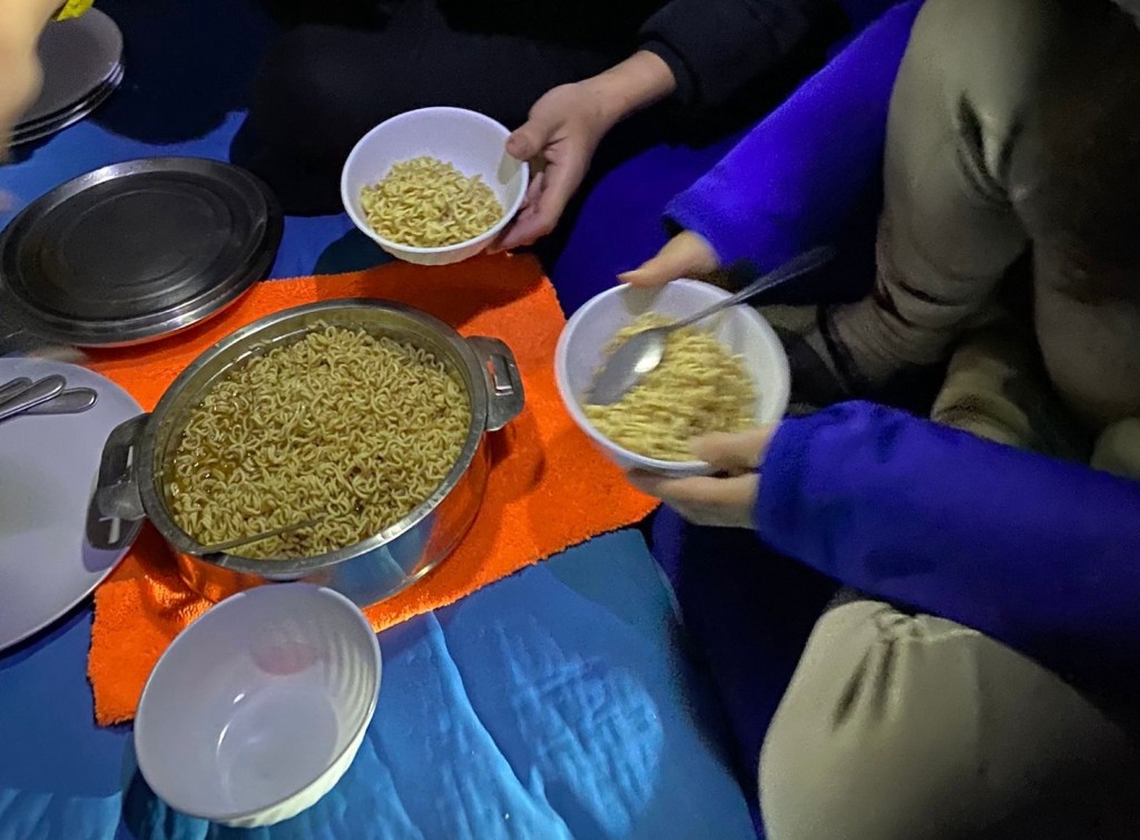 晚上沒睡幾個小時,醒來三人一起把泡麵吃了。