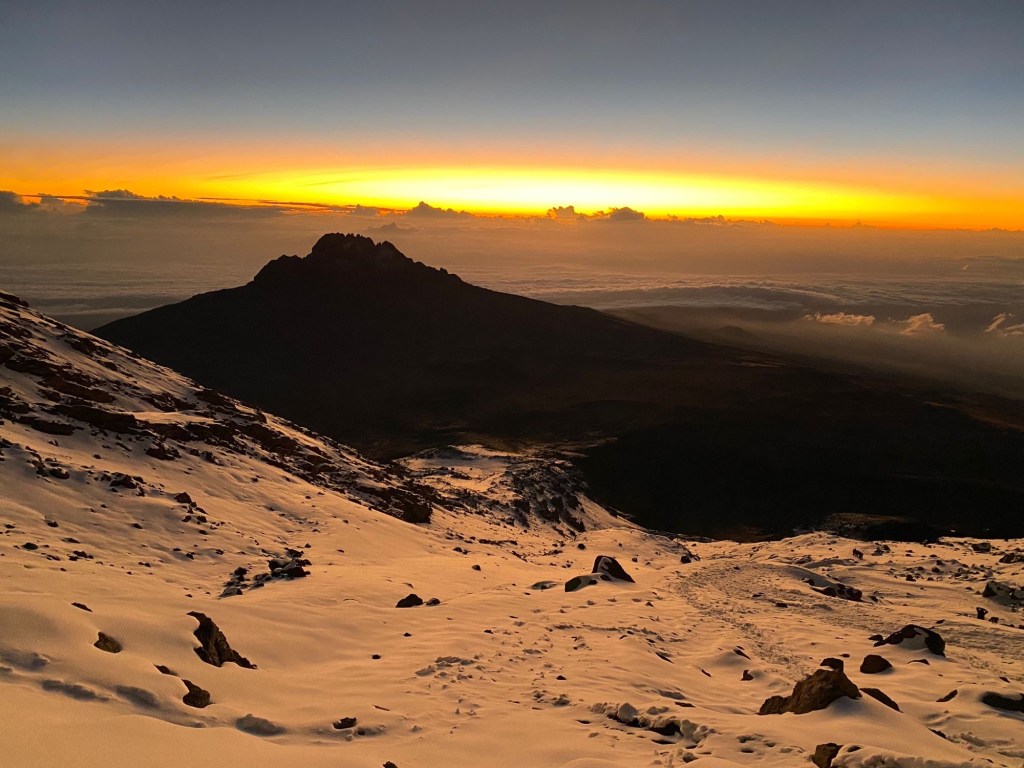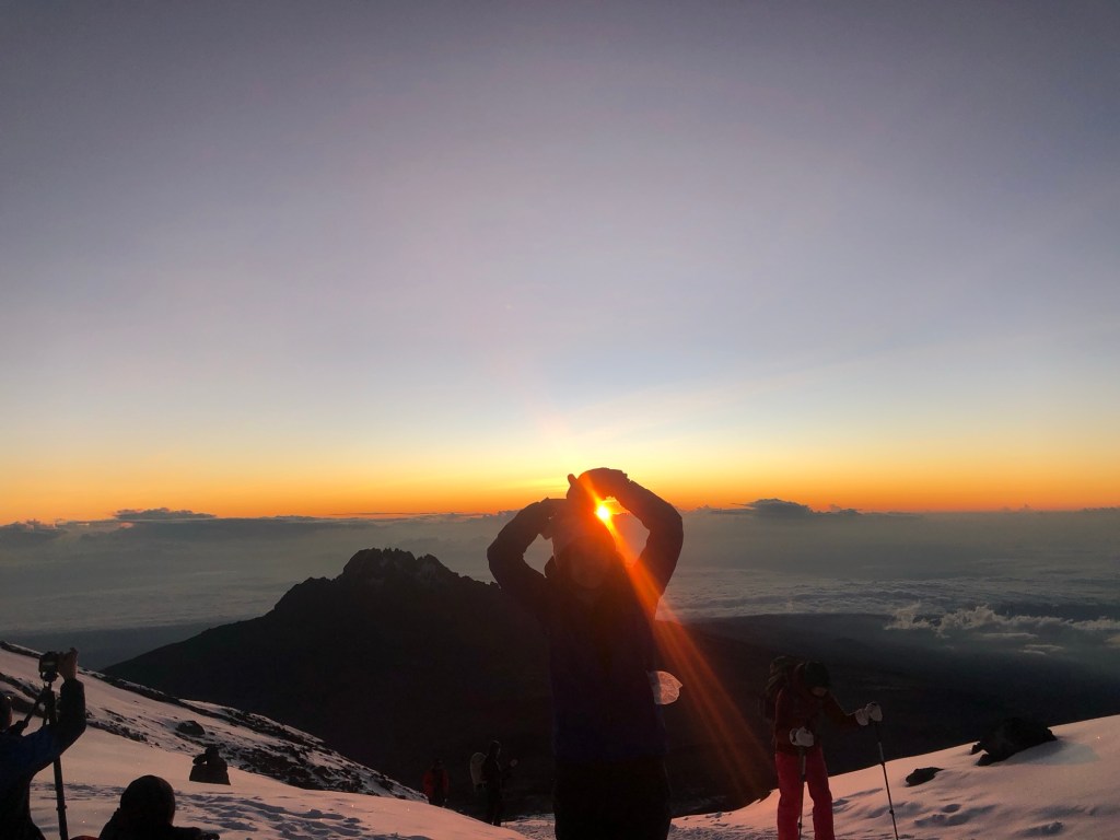 我們真的趕在日出前幾分鐘抵達了 5756M的 Stella point! 看見太陽浮出雲海照在我們身上,內心超感動啊啊啊!